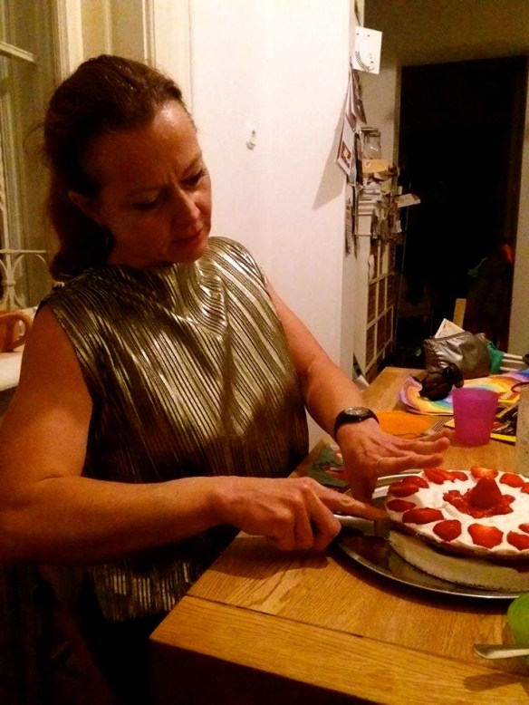 Volt torta: én sütöttem, és amíg néztük az Ozont, addig fagyott. Ez egy nagyon kevéssé édesített, kétharmadrészt hajdinás lisztkeverékből, de minimális tésztalappal bíró, erősen tojásos-vajas, vaníliás, mandulás, tejszínes és epres kompozíció volt. Az eper, azt hiszem, kiütötte a Juliskát, még figyeljük, mitől van a ragya rajta.