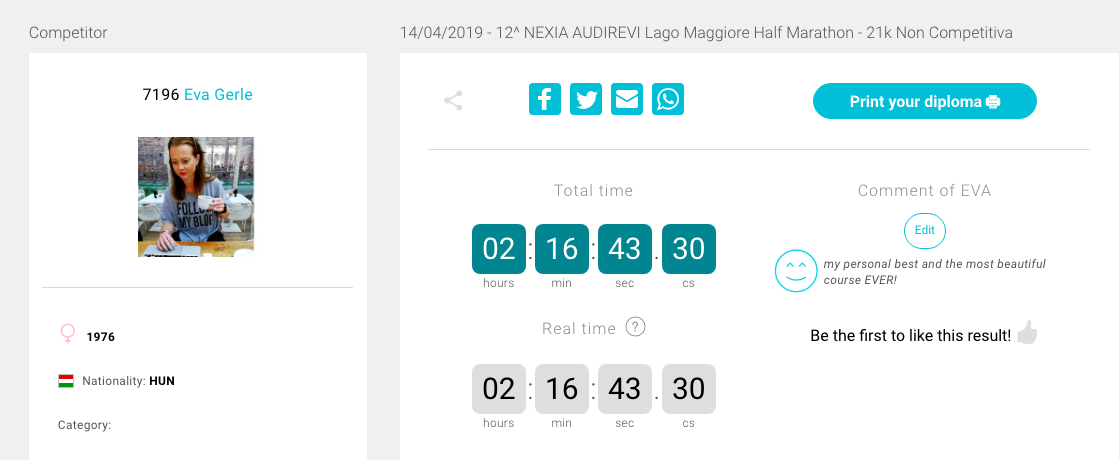 G. Ármin testnevelő segítségével pedig igen szép eredményeket érek el újabban a hosszútávfutásban. A mostani, a Lago Maggiore félmaraton 2 óra 16 perc 43 másodperc lett, aminek, egy héttel a berlini félmaraton után (2:26:38) igen örülök, de mivel nem szeretek üresen ujjongani, sem vetíteni, hangsúlyozom, hogy ez könnyű pálya volt (fel nem torlódó, senkit nem kerülgetős, kisebb létszámú, sima aszfaltú, több helyen enyhén lejtős), továbbá a tempó tartásában a sportórás monitorozás (aki a testnevelő, a képen a bal csuklómon látható) nagy segítségemre volt. Mindenhol a rövid íven (a valós távon) futottam. Mindig is így kellett volna, és ez metafora.