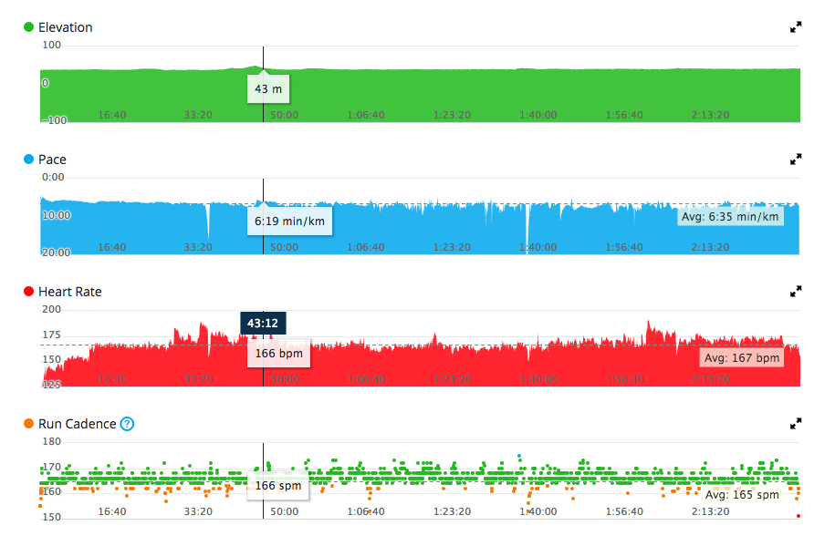 Most az egyik nagy és új élmény a G. által kölcsönzött Garmin sportóra használata volt. Én ugye életemben nem monitoroztam, kütyüztem semmit, de G. pont azzal az órájával jött, így adódott a kölcsönkérés (aztán kedvesen gratulált neki az alkalmazás, hogy milyen szuper félmaratont futott!). Pontosan a rajtvonalon, az első lépésnél indítottam be, de fél perccel később kapcsoltam ki. A Garmin híresen túl is mér, de tényleg jóval többet futottunk a 21097 méternél a kerülgetések miatt. Itt vannak az adatok, útvonal, mindenféle: