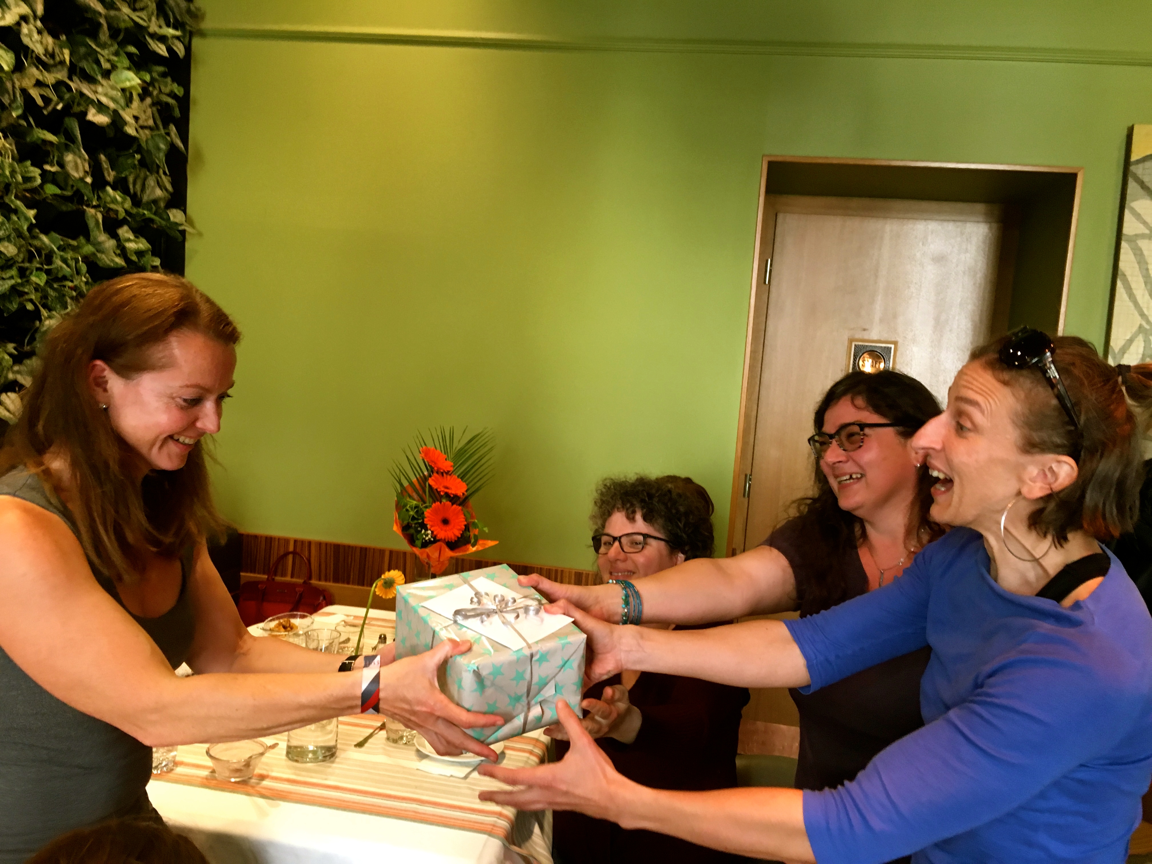 Narancssárga gerberát kaptam, és, igen, biciklin hazavittem a csokrot, amelyik kibírt még egy színházi estét is. Dóra, Esther, Judy összedobtak nekem egy Bialetti indukciós mokkát! Ha kifogyna a kapszula. Bár ebben is Illyt főzök.