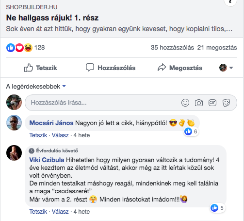 A Shop builderre havi 3-4 cikk készül, nem teljesen egyenletes sűrűséggel. Mindig én találom ki a témát. Igen nagy elérést építettek ki a webshop révén (hírlevél, facebook, honlap). Nem kell megtagadnom az elveimet, alter, módszer- és szerellenes cikkeket írok, elfér a csirkerizs mellett a böjt és a ketó.
