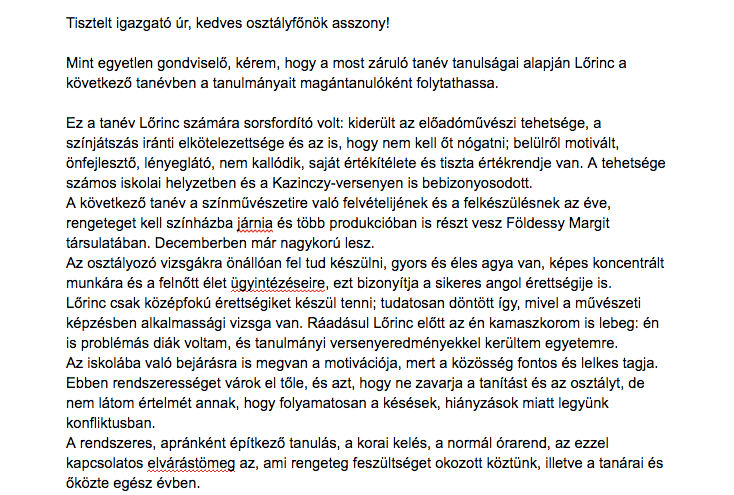 Eddig semmi ilyesmi nem volt. De ha most nem fogja fel, hogy b..hatja, ha olyan suliba kell járnia, ami nem lesz jó neki, akkor mit tegyek? Hagyjam a gondviselésre? Egyedül az vigasztal, hogy ha nagyon gáz, menet közben is lehet váltani. Tudott végül Lőrinc magántanuló lenni? Pont most változott a törvény. Sportoló fiút nevelő komaasszonyom egyéni tanrendet kért.