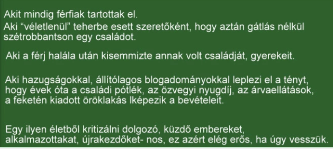 Nem akarom, hogy vele történjen valami (törvényszerűen történik, mert a felgiccselt hazugság mindig bedől, de nem miattam van ez). Én azt akarom, hogy a hamisság tudatosodjon a női nyilvánosságban. Vegyék észre, ne támogassák. Nem átkoztam meg (ő igen: “Élj úgy, hogy ha irgalomra szorulsz, akkor legyen kihez fordulni”, ezzel azt akarta mondani, és. saját, személyes facebookomra írta!, hogy legyek én is beteg).