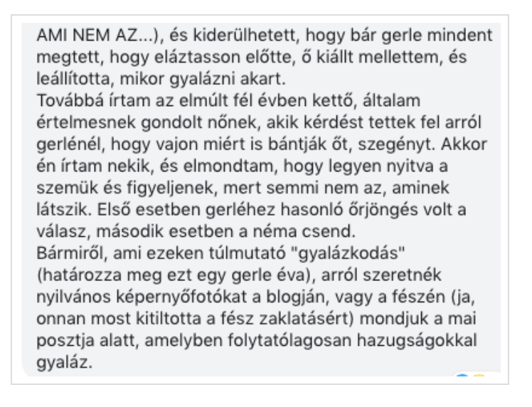 Ezzel a posztjával uszította rám az akkor 55 ezer követőjét. Akik viszont már az én oldalaimra jöttek – én nem az ő oldalára írtam, és nem csak azért, mert ott érzelmi azonosulás, buta nőtömeg és szektás hűség van, hanem mert én itt foglalkozom a nők közéletének visszásságaival, posztok ezreiben (négyezer van 2024 nyarán), olvasnak elegen itt is, és nem másoknál szítom az ellentéteket.