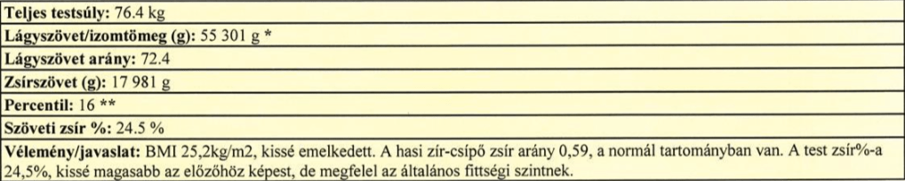 Annyi adat van, ez a technológia egy csoda. Mindenfélét lehetne mondani gyors ránézéssel is a test szimmetriájáról, a gerinc állapotáról, a csonttömeg változásáról, ismételt mérésnél többéves folyamatokról, öregedésről, hasi zsír-csípőzsír arányokról (mivel ez metabolikus betegségek előrejelzője); arról, hogy mi az egészséges tartomány, mi a sportolói szint. Pont azért megyek oda, hogy a magas BMI-met (azt itthon is kiszámolom, köszönet) tudva lássam, miből áll össze a súly, csökkent-e az izmom, zsír-e a többlet, jó felé tartok-e. Sem az összetétel, sem az egészség szempontjából nem igazít el a BMI.