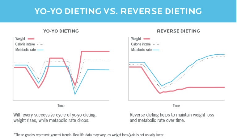 A második ábra testépítőjénél a súly mélypontja a fenntarthatatlanul-döbbenetesen zsírtalan-izmos versenyforma, onnan nő a súlya valamicskét. A reverse azt jelenti, hogy a mélypont után lassú tudatossággal növeli a kalóriabevitelt, közben edz is, és lassan alkalmazkodik az anyagcseréje is, az alapanyagcsere emelkedésével.