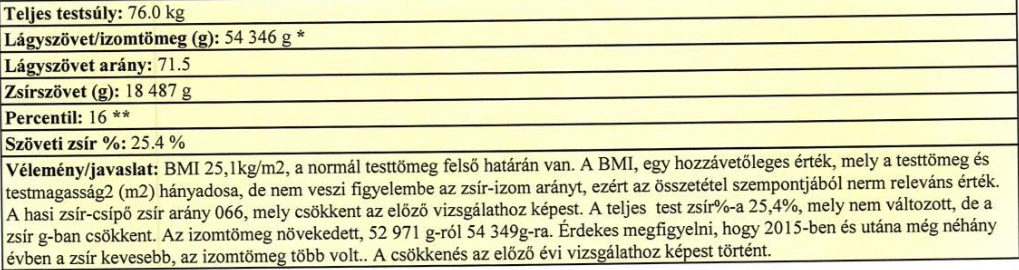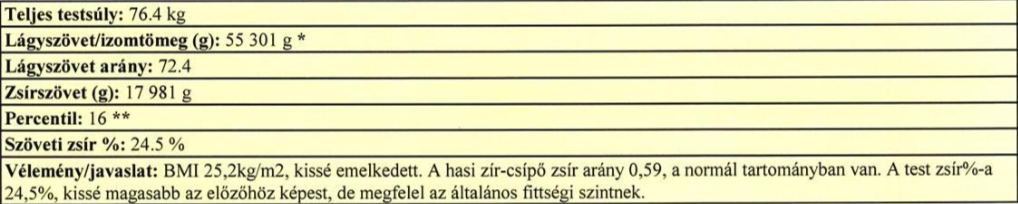 Annyi adat van, ez a technológia egy csoda. Mindenfélét lehetne mondani gyors ránézéssel is a test szimmetriájáról, a gerinc állapotáról, a csonttömeg változásáról, ismételt mérésnél többéves folyamatokról, öregedésről, hasi zsír-csípőzsír arányokról (mivel ez metabolikus betegségek előrejelzője); arról, hogy mi az egészséges tartomány, mi a sportolói szint. Pont azért megyek oda, hogy a magas BMI-met (azt itthon is kiszámolom, köszönet) tudva lássam, miből áll össze a súly, csökkent-e az izmom, zsír-e a többlet, jó felé tartok-e. Sem az összetétel, sem az egészség szempontjából nem igazít el a BMI.