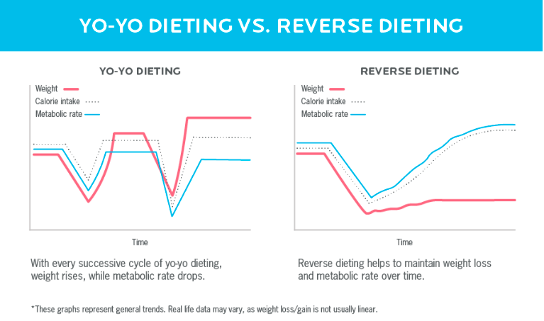 A második ábra testépítőjénél a súly mélypontja a fenntarthatatlanul-döbbenetesen zsírtalan-izmos versenyforma, onnan nő a súlya valamicskét. A reverse azt jelenti, hogy a mélypont után lassú tudatossággal növeli a kalóriabevitelt, közben edz is, és lassan alkalmazkodik az anyagcseréje is, az alapanyagcsere emelkedésével.
