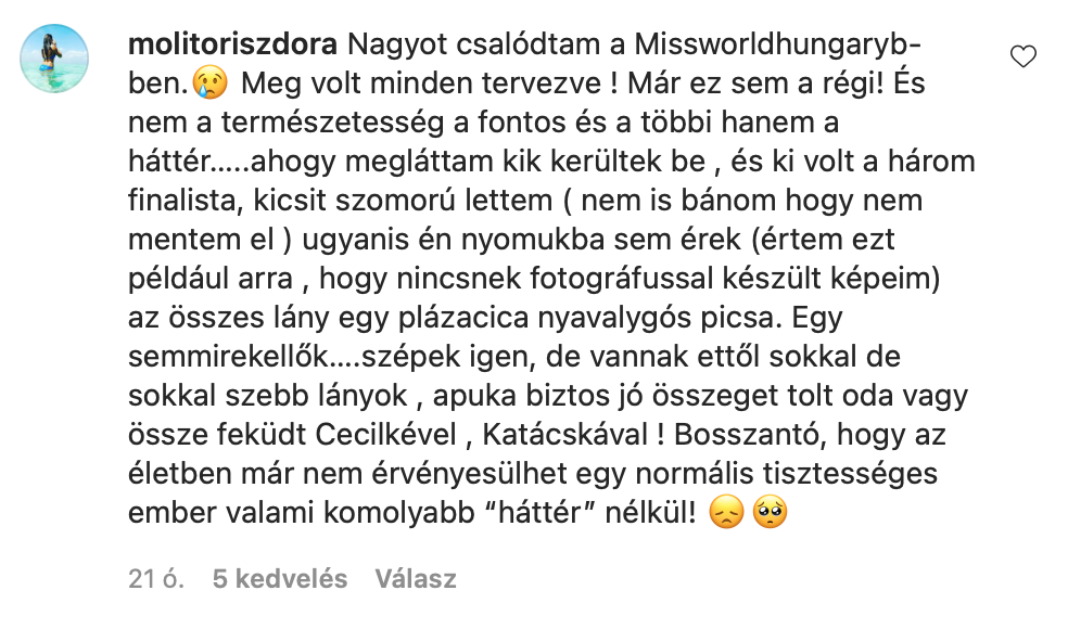 Top komment Keserűfalváról. Ez a leány a szabvány szépségkirálynő-paramétereknek semmilyen tekintetben nem felel meg (“nyomukba sem ér”), és nem a fotói minősége miatt, hanem alkatilag, de azért lepicsázza azokat, akiknek összejött. És arról nem is beszéltünk, hogy miféle életcél a nemzeti stricibizniszbe bekerülni, az ember erre megjegyzést se tesz (ami szerencse, mert úgysem elég szép hozzá).