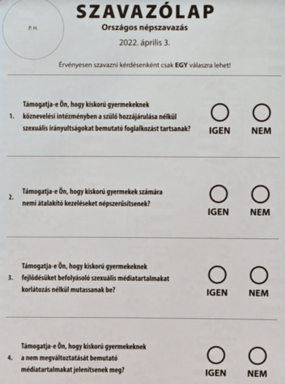 Érvénytelen szavazásra a jogvédő civilek nem csak azért buzdítanak, mert meg akarják hiúsítani a kormány agresszióját és mellébeszélését, amely az értelmetlen és téttelen kérdésekben ölt testet, és amelyekre minden érvényesen szavazó nemet mond. Hanem azért is – és erről senki nem beszél –, mert csupa érvényes szavazattal nem lenne igen szavazat, ami az LMBT-aktivizmus nyílt kudarca lenne. Akár ellenzéki, akár kormánypárti vagy, az minimum konszenzus, hogy dehogy akarjuk agymosni és tönkretenni a gyerekeket.
