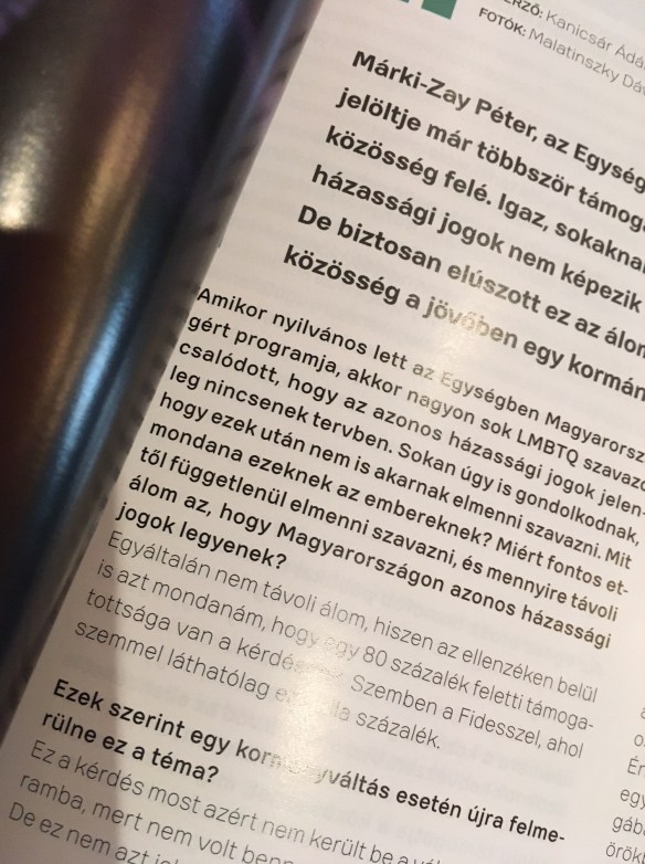 Mi nem a centrum vagyunk társadalomelméleti értelemben, de Magyarországon is mindenki rég tudomásul vette (tényleg csak maroknyi kereszténykedő-magyarkodó kivételével), hogy léteznek melegek, másfajta szexet kedvelők, nem-monogám emberek. Ha viccelődés tárgya is, mint minden furaság, ez már nagyon engedékeny, nincsen üldöztetés, sem erőszak, intézményes végképp nincs. Tele van büszke, gazdag, out melegekkel a média, a politika. Senki nem vitatja, hogy joguk van a magánéletükhöz. Vagyis: jogegyenlőség van, nincsenek diszkriminálva. Az emberek véleményét, preferenciáit meg bízzuk rájuk (ezt nem bírom, ahogy ilyen osztályfőnöki órásan, moralizálva erőltetik, hogy mit szabad gondolni, mondani, merrefele kell még jobban elfogadni).
