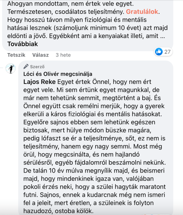 Hozzászólnak aggodalmas szülők, a saját gyereküket dicsérgetve, mértékletességre figyelmeztetve, önigazolva. Meg kell hagyni a gyerekkort a játéknak, írják elhízott emberek. És megjelenik a “szakma”, ellepik a család sportoldalát. Köztük komoly futók, futós bloggerek, edzők is, akik között én az évek alatt láttam már egészen elkeserítő konfliktusokat, konfrontatív és önimádó személyiségeket, versenyszervezői féltékenységet, faszméregetést, értelmetlen hitvitát és becsvágyat: aszfaltosok, maratonisták kontra ultrázók, sima futók kontra triatlonosok, Lubics Szilvia szakítása az edzőjével, sportszerűtlenség. Maráz Zsuzsannát férfi blogger lezsuzsizza, a többieket teljes nevükön emlegeti (szóltam). Rémisztő alakok, akik folyton kinyilatkoztatnak. A saját, elit tempójuk, edzésmennyiségük a norma, kirekesztőek, mániákusok és önimádók, kákán is csomót keresnek; minősítgetik mások felkészültségét, rajthoz állását, profiknak való terminusokkal dobálóznak, csúful meglovagolják az életközépi válságban és tönkrement házasságban vergődő tömegek bizonyítási vágyát. “Ötórás maratonnak nincs sportértéke”… én ezt megutáltam már kb. 2018-ra. Az állandó mansplaininget, kioktatást. A versenyek szexizmusát is: pasik méregetik a nők fenekét, versenybeszámolókban rendszeresek az egyoldalú szexista megjegyzések, férfiak jelmezben futnak nők között, a női versenyek létjogosultságát elemezgetik; az iramfutók is férfiak a női futáson, lekezelően “biztatják” a nőket. Csanya is nekem esett (önkéntes voltam az ő bizniszversenyén).