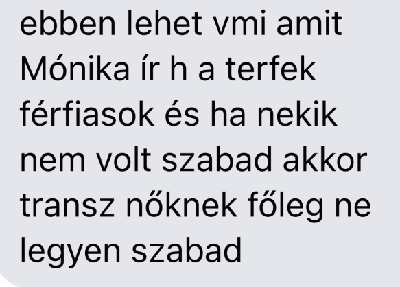 Én sokáig úgy voltam vele, hogy a transzkodó egyénnel szemben tompa jóindulat van bennem, ami jár a szenvedőnek, útkeresőnek, ami azt is jelenti, hogy elhittem, hogy szenved. Sőt, segítőkészen lelkiztem a közösség három tagjával is. Az ideológia pedig idegen volt: én nem bírom ugyan az unásig ismert szövegeiket, de nem mondom ki, hogy mindez abszurdum, nincs is vele dolgom, ártalmatlan. Most meg már úgy vagyok vele, hogy az egyén nem érdekel nagyon, nincs felelősségem, nem is nézem, szimpatikus-e, nem kell hinnem neki, nem ő a lényeg, ő csak megtestesíti, magára ölti az ideológiát, amely viszont a manipulációival, valóságtagadásával csábító, káros, borzalmas. Elvisz egyenesen a meghatottságba és követelőzésbe – kiút a rakás szerencsétlenségeknek. Most, hogy ezek az emberek nekem estek, mert nem volt érvük, azt gondolom, hogy semmilyen megértést nem kellett volna tanúsítani, a legelejétől egyszerű, indulatmentes nemet kellett volna mondani az egészre. A nők méltóságával, és az ő érdekükben: ezek a határaink, ezt jelenti a NŐ szó, és azt meg nem. Nem engedünk egy tapodtat sem.