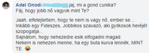 Tehát akkor foglaljuk össze: egy magát nőnek képzelő férfi (”Adél”) megmondja egy nőnek (L.-nek), hogy ő, “Adél” jobb nő nála, hiszen L. nem is nő (persze vele, a herélt “Adéllal” ellentétben), sőt, L. nem is ember, ráadásul buta k*va is, aki gyilkosok heréjét szopogatja. (Ahhoz képest, hogy “Adél” szerint L. nem nő, klasszikus nőgyűlölő gyalázkodásokkal akarja elhallgattatni. Semmi meglepő, a szokásos transzaktivista tempó.)
