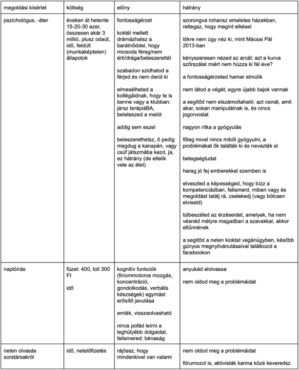 Csak hát nem bírom a maszatolást, hamisságot. És ennek fontos lelki, egészségvédelmi szerepe is van: deklarálni a hamisság ellen az igazat, és az erőszakos vagy buta kommentelők ellen az énemet, azt, hogy nem félek – ez olcsóbb, kézenfekvőbb és jólesőbb is (viccesebb), mint hetente járni 20 meg 25 ezerért valami kóklerhez. Akinek úgyis csak azt nézném az arcán növekvő feszültséggel, hogy miért nem húzza ki azt a szőrszálat. És házi feladatot ad! És irritáló szavakat használ! (“Első körben.” “Trauma.” “Csomag.”)