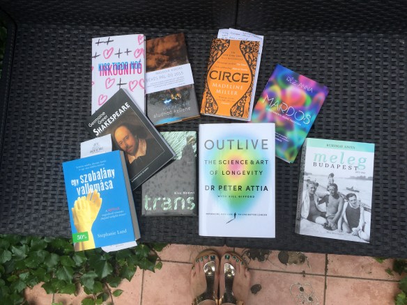 A többi könyvet, hatot pedig én vettem. A Circe mitológiai regény a varázslónőről, egy klasszikafilológus professzor írta, gyönyörű a borítója is, benne regényjegyzeteim maradtak. Réz Anna Mardos című esszéje az anyai bűntudatról és hétköznapi szégyenekről szól, ez a borító is nagyon tetszik. Az Egy szobalány vallomása egyszerű bestseller, töredékáron vettem, szórakoztató. A Meleg Budapest tudományos igényű, sok jegyzettel ellátott, lebilincselő ismeretterjesztés százéves sztorikkal. Kiss Tibor Noénak régi adósa vagyok (olvasással), ez az első két könyve, dedikáltattam. A papucsom Scholl és egy álom.