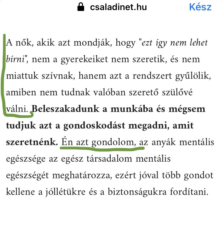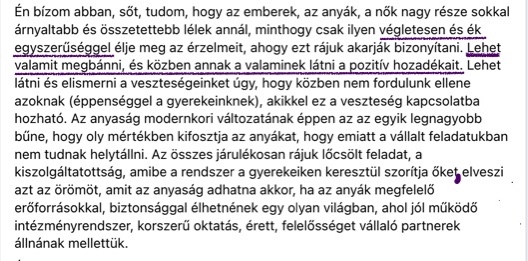 “De ilyen, hogy valaki magyar nyelven az arcát, nevét vállalva, anyaként azt mondja, hogy hát gyerekek, ez így egy irtó nagy átb’szás… Na, ilyen nem nagyon volt. És amikor volt, például amikor lassan tíz éve elkezdtem erről is írni, akkor meg jött minden, csak hallgassak el végre. DE ezzel együtt jöttek olvasók is, bátor, klassz nők, akik azt mondták: Igazad van, asszony! Én is így gondolom.