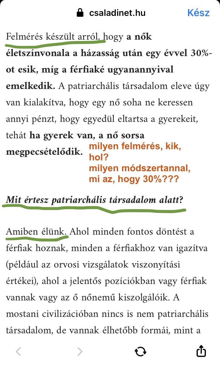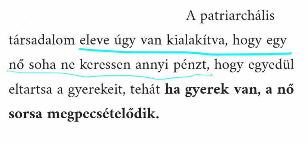 A hozzá nem értés, nagyzoló elméletieskedés több ponton kínos – a szerkesztőnek felelőssége, hogy ilyen színvonalat nem helyez a kvázi szakértő pozíciójába. Nem ezt jelenti a patriarchátus, a feminizmus. Nem igaz, hogy a nők nem keresnek jól (hanem az alacsonyan képzett, vidéki, rossz infrastruktúra közepette élők). Az sem igaz, hogy ha a nők nem keresnek jól, az azért van, mert anyák. De most tényleg: a családtámogatás (adókedvezmény, gyed, CSOK…) baj, mert Orbán, vagy jó lenne még belőle?