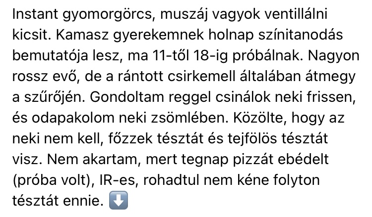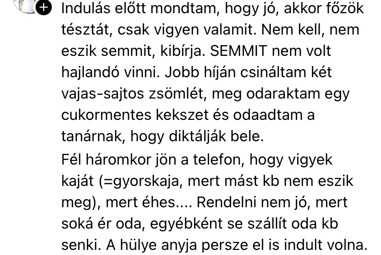 Erre nem is lehet mit mondani. Elképzelhetetlennek tartom a játszmázásnak ezt a fokát, a segítségkérésnek álcázott nyilvános magamutogatást (a külön élő apa gyorskajával tömi a gyereket).