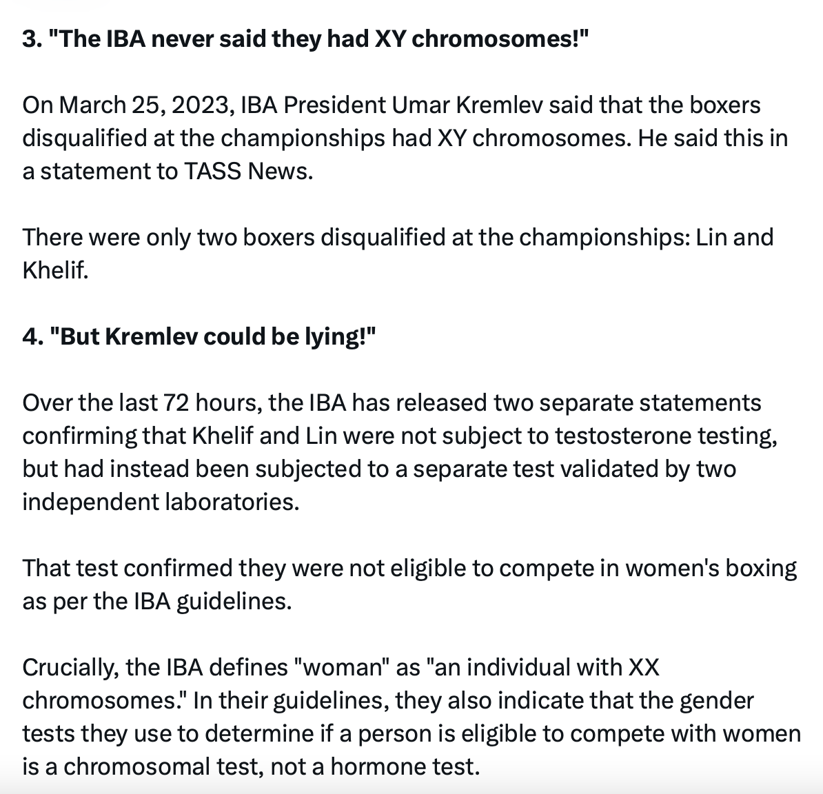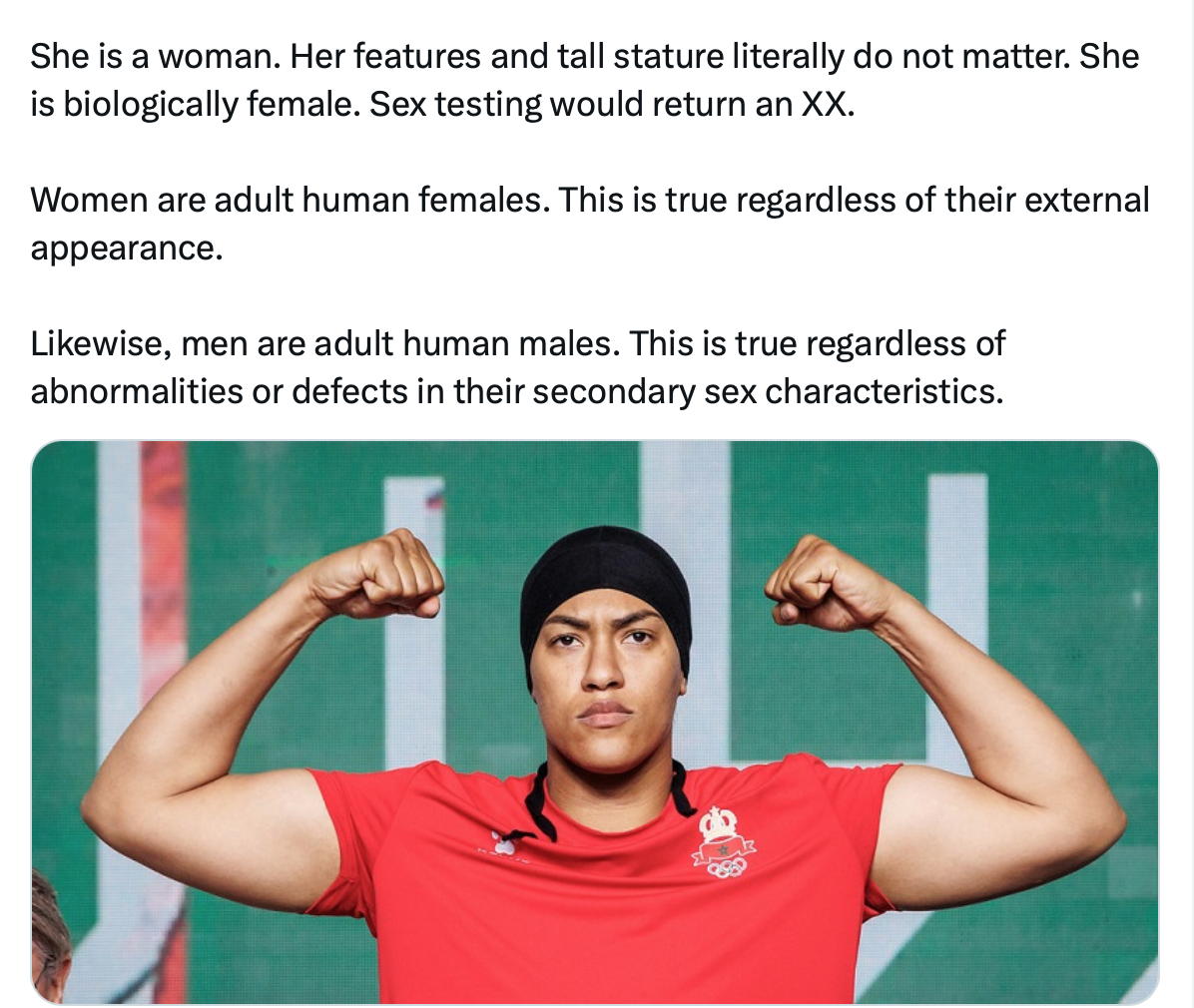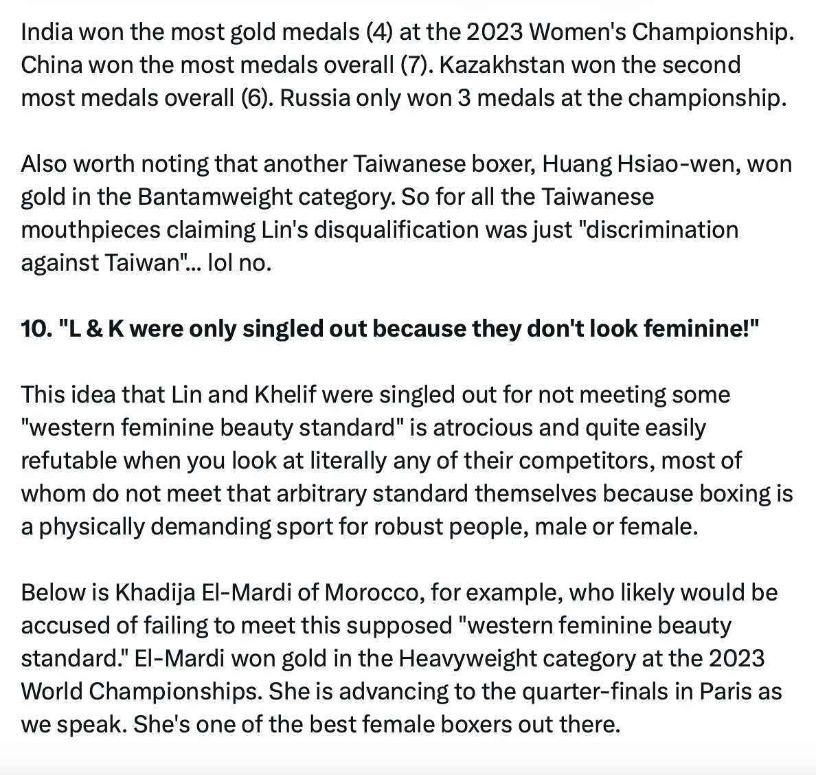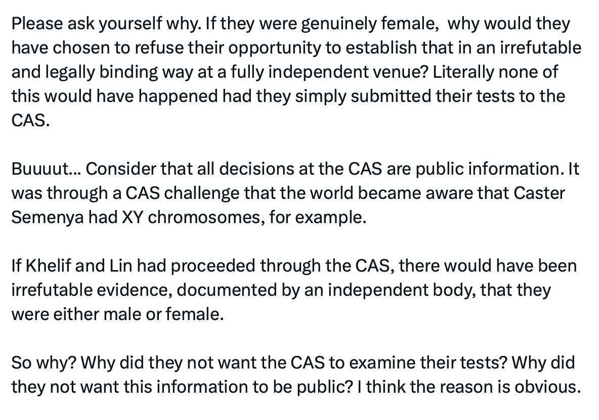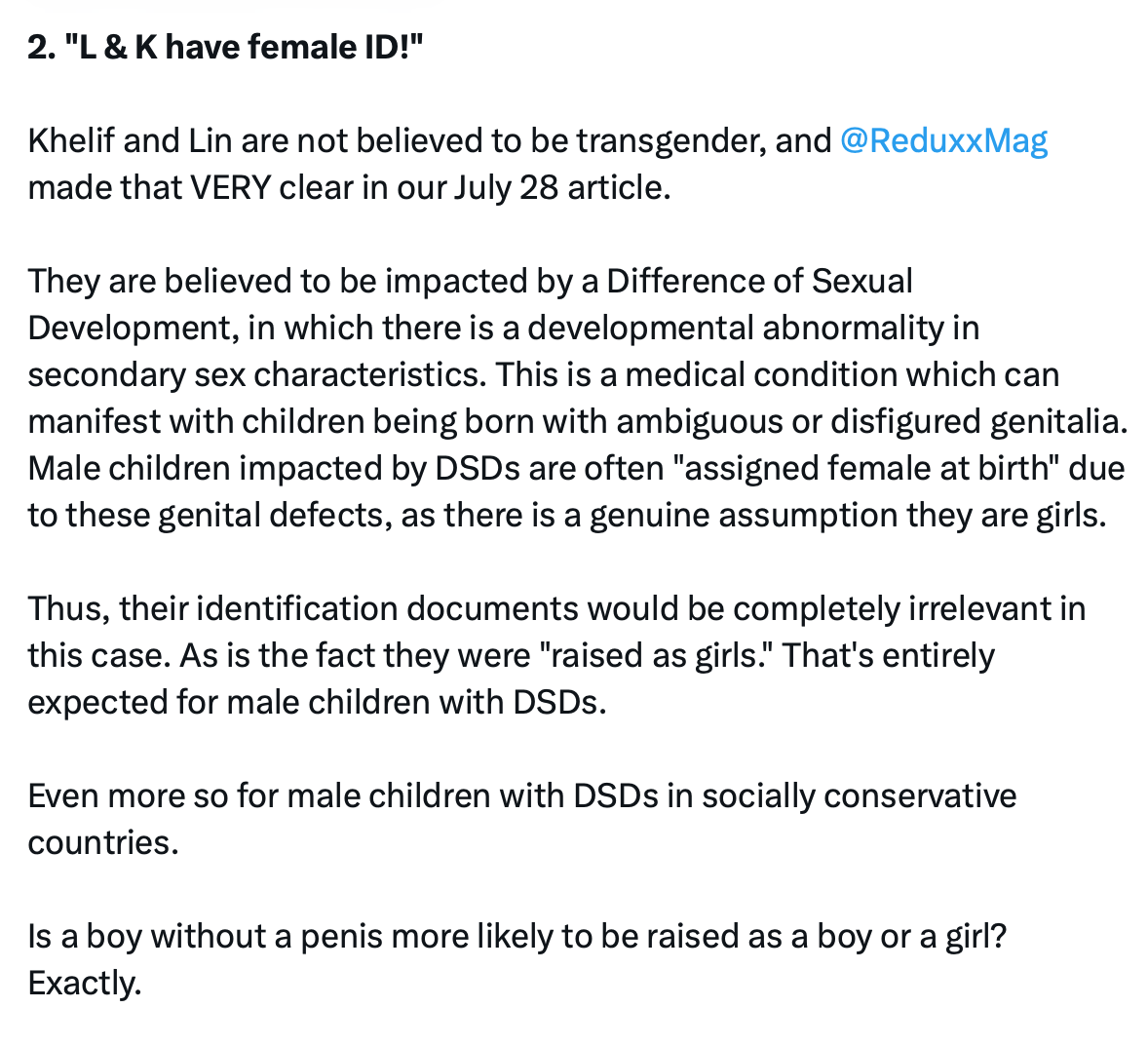 Kettő: a női sport mint kitörési lehetőség csak az esélyegyenlőség védelme mellett létezik. A sportban nagy pénzek vannak, ezért lehet nők kiemelkedési esélye a versenyzői karrier. Az LMBT-érzékenyítés, emberek érzelmi zsarolása ellenben kitűnő lehetőség arra, hogy középszerű férfiak beleüljenek nőknek járó lehetőségekbe, mert testi előnyeik vannak a nőkkel szemben, vagy kvótáknál a csiribiri voltuk védi és teszi bírálhatatlanná őket (“inklúzió”). Irreleváns, hogy Khelif nem tehet az állapotáról, és nőnek hitte magát.