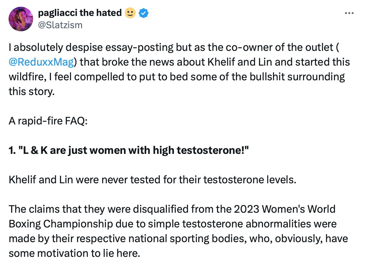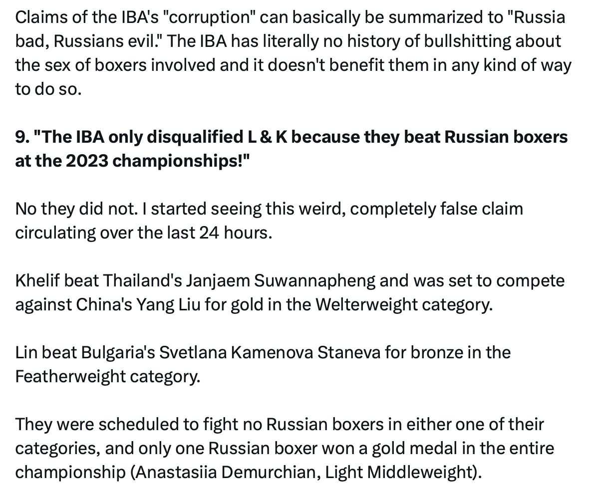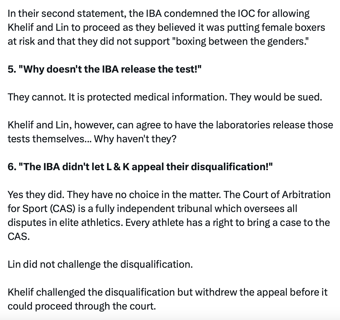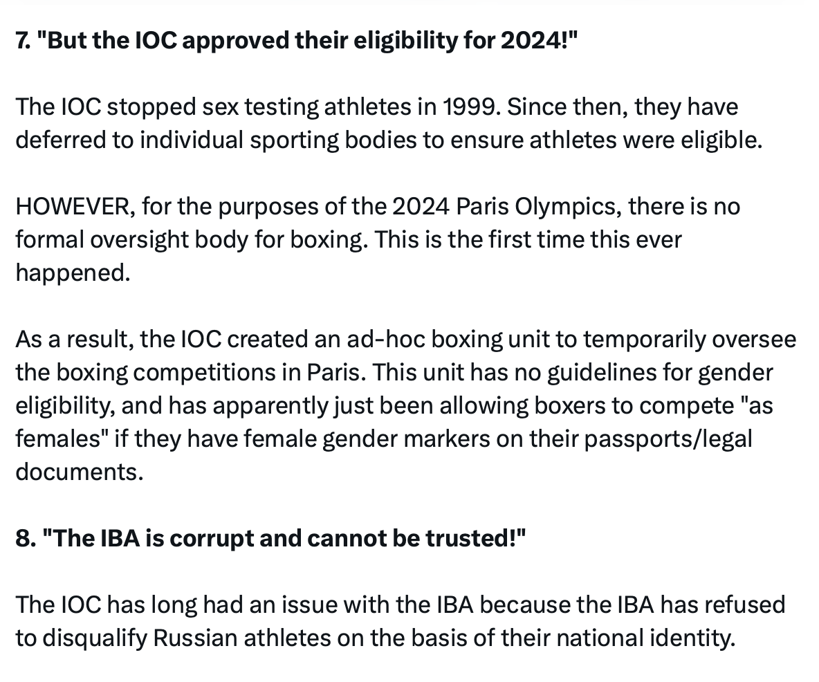 Kettő: a női sport mint kitörési lehetőség csak az esélyegyenlőség védelme mellett létezik. A sportban nagy pénzek vannak, ezért lehet nők kiemelkedési esélye a versenyzői karrier. Az LMBT-érzékenyítés, emberek érzelmi zsarolása ellenben kitűnő lehetőség arra, hogy középszerű férfiak beleüljenek nőknek járó lehetőségekbe, mert testi előnyeik vannak a nőkkel szemben, vagy kvótáknál a csiribiri voltuk védi és teszi bírálhatatlanná őket (“inklúzió”). Irreleváns, hogy Khelif nem tehet az állapotáról, és nőnek hitte magát.