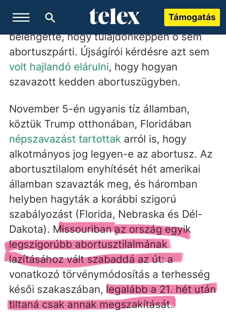 És ezt most lazították. Trump – a Telex cikke szerint is – mindig azt mondta: maradjon az abortuszról való döntés tagállami hatáskörben. Ezért is tartottak az elnökválasztással egyidejűleg népszavazást tíz államban (ebből három lazított). Ami megszűnt szövetségi szinten, több évtizedes kampánymunkával, az elvi dolog: az abortusz mint alkotmányos jog, ezért biztosítani KELL.