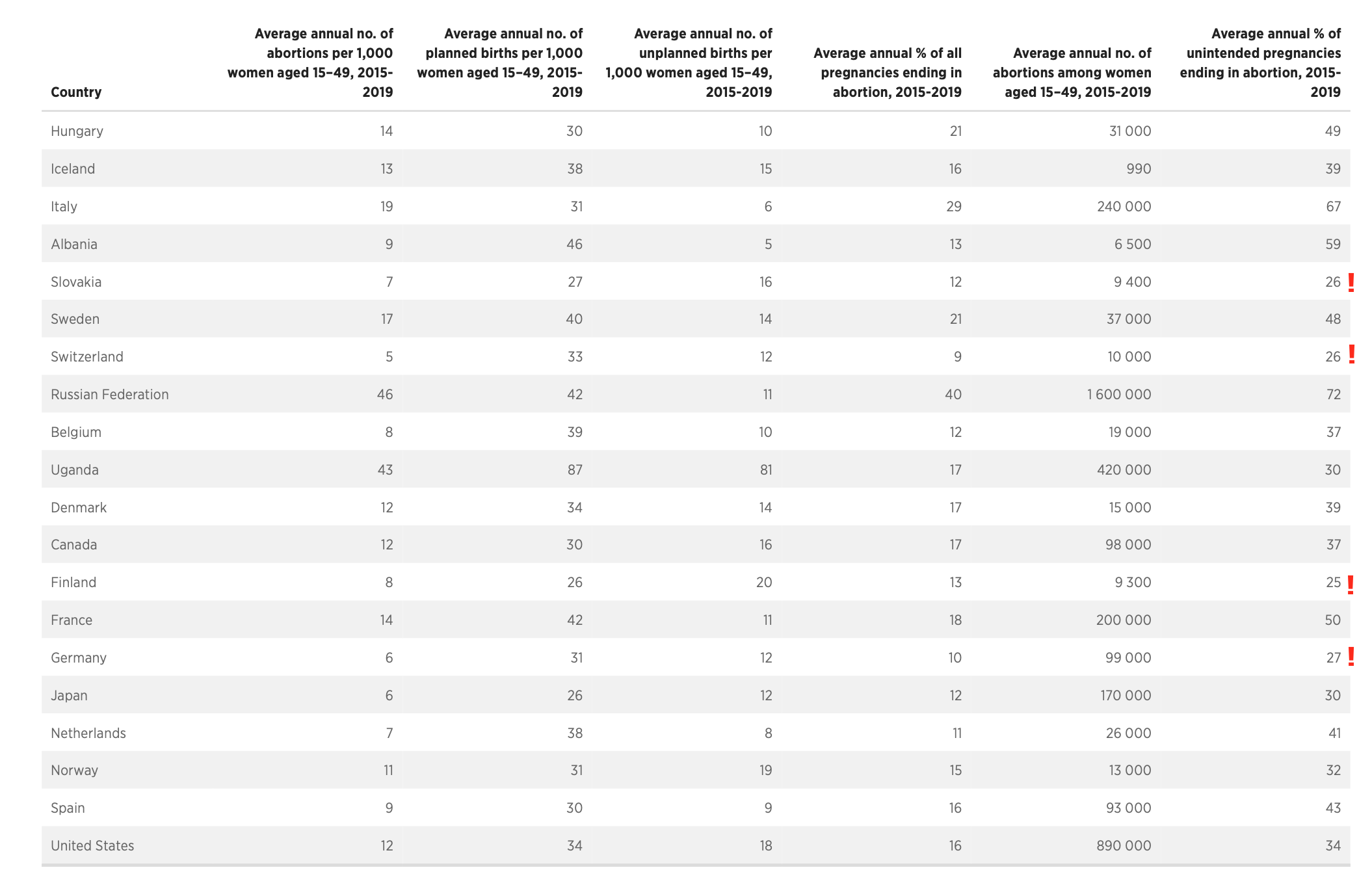Másfajta adatok vannak, egy kicsit más időszak, Guttmacher: Európa gazdag államai, egy-két szegény európai, illetve szomszédos ország, illetve Uganda, Kanada, Amerika, Japán és Oroszország is. Málta nem szerepel a Guttmacher listáján. Az olasz adat kiugró, az orosz elborzasztó. A felkiáltójel a sorok végén azt jelenti, hogy ezekben az országokban nem dől össze a világ egy nem tervezett terhesség vállalásától: