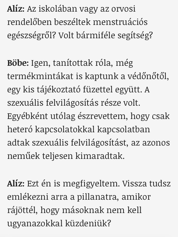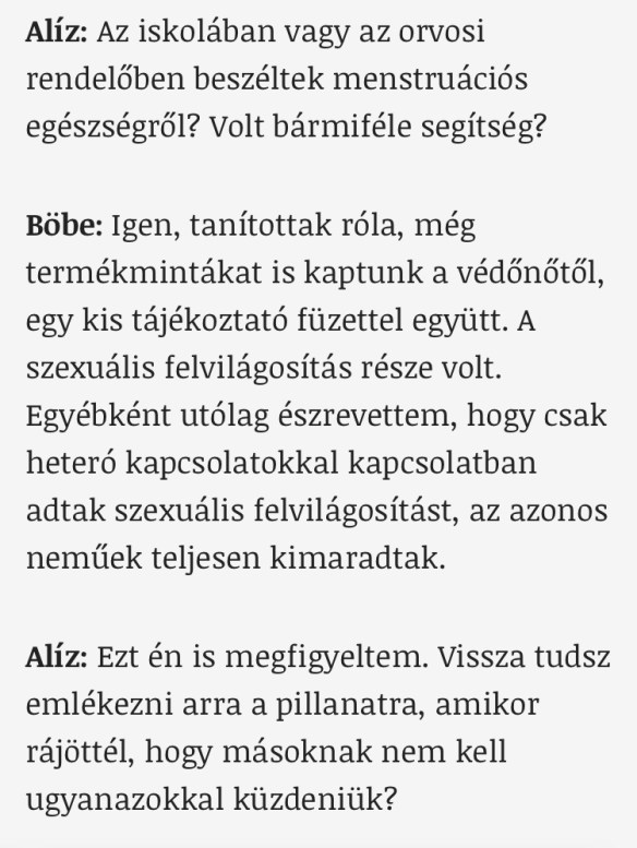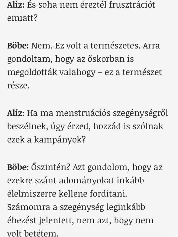 Annyira unom már a hablatyot elkényeztetett harmincasok álproblémáiról. A fölényeskedést. Menstruációs szegénység – egy magát nőnek gondoló férfi kérdezget egy nőt, akinek ez nem volt probléma. Mert az éhezés volt a probléma. A végén mégis elkönyveli a fickó, hogy “ezt sokféleképpen lehet megélni”, és leszögezi, hogy igenis nagyon súlyos probléma a MENSTRUÁCIÓS SZEGÉNYSÉG.