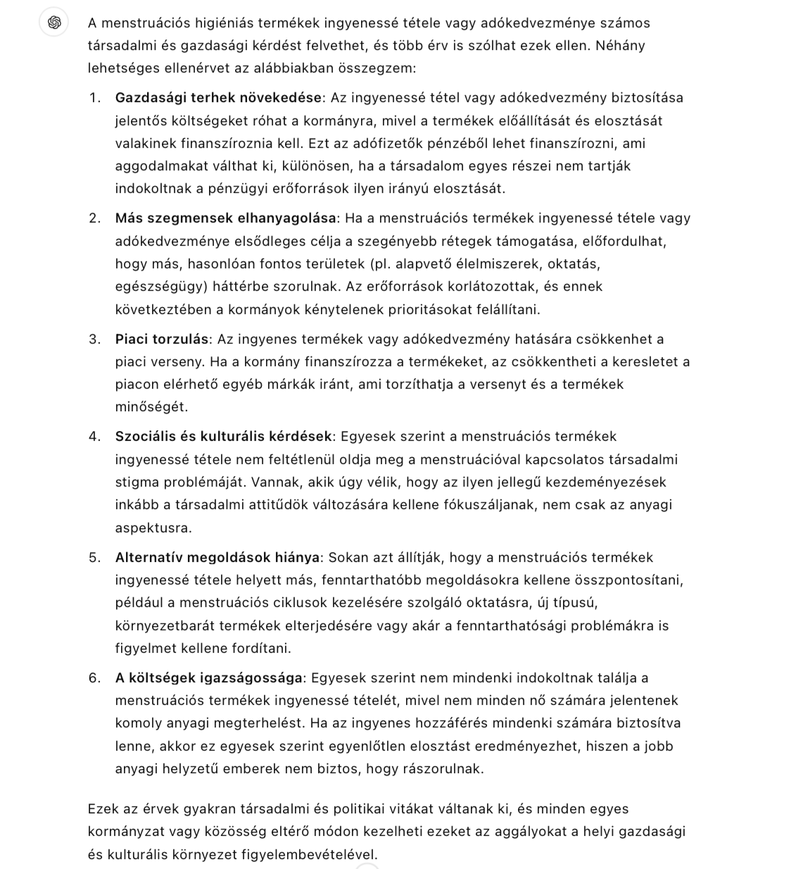 Megkérdeztem a chatgpt-t is, általánosságokat hablatyolt. Ennyire bárki képes, ha fegyvert szorítanak a halántékához: cáfold, hogy értelmes cél volna a menstruációs termékek ingyenessé vagy áfamentessé tétele:
