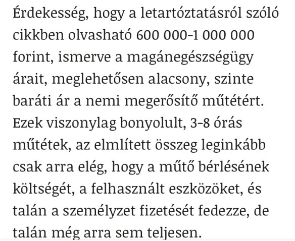 Az aktivista itt is durván csúsztat: nem azért 600 ezer-1 millió a műtétek ára, mert a doktornő one nyerészkedett volna (ISTEN ŐRIZZ!). Pedig ezt erénynek számíttatná be “Zsófia”. Hanem azért, mert ezek nem a drága beavatkozások, nem a nemváltó műtétek, ahogy fent is írtam. Magyarországon csak a kisebb műtéteket végzik, ezekből lehet némi hasznot szedni, főleg ha monopolhelyzetben marad az orvos, és sikerül TB-támogatást szerezni egy kis ügyeskedéssel a dokumentációban. Nemi diszfória (transzszexualizmus) helyett jellemzően hamis hererák-diagnózissal távolítják el a szervet. (Másik aktivista szíves szóbeli közlése.) Előbbi esetében 90 százalékot áll a páciens, az utóbbit teljes egészében a TB fizeti. Hogy a második lehetőségnél a páciens által fizetendő ár mennyi, én nem tudhatom, de bőven van mozgástér. Így károsítják meg a kasszát.