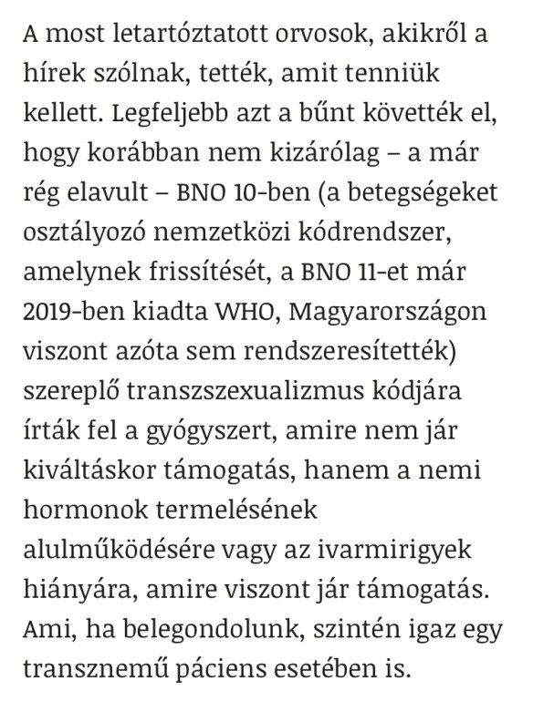Most viszont elakad a hormonfelírás és utánkövetés, hegkorrekció is, nem csak a műtétek. A többi orvos nyilván félni fog ezek után. Műteni pedig senki nem fog. Maga “Olivér” azt ajánlja, hogy egyetem környéki endokrinológust keressen, akinek hormon kell.