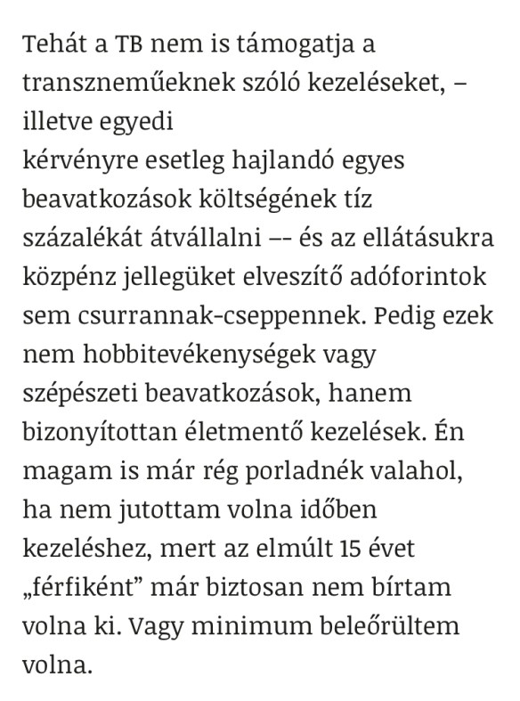 …ezek nem hobbitevékenységek vagy szépészeti beavatkozások, hanem bizonyítottan életmentő kezelések. Én magam is már rég porladnék valahol, ha nem jutottam volna időben kezeléshez, mert az elmúlt 15 évet „férfiként” már biztosan nem bírtam volna ki. Vagy minimum beleőrültem volna.