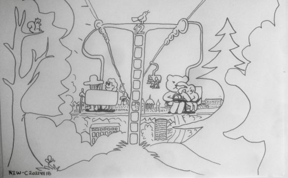 2021 nyarától intenzív rajzos korszak, töltőtoll, önkifejezés. Maci és Nyuszi szerelme, vakok a libegőn.