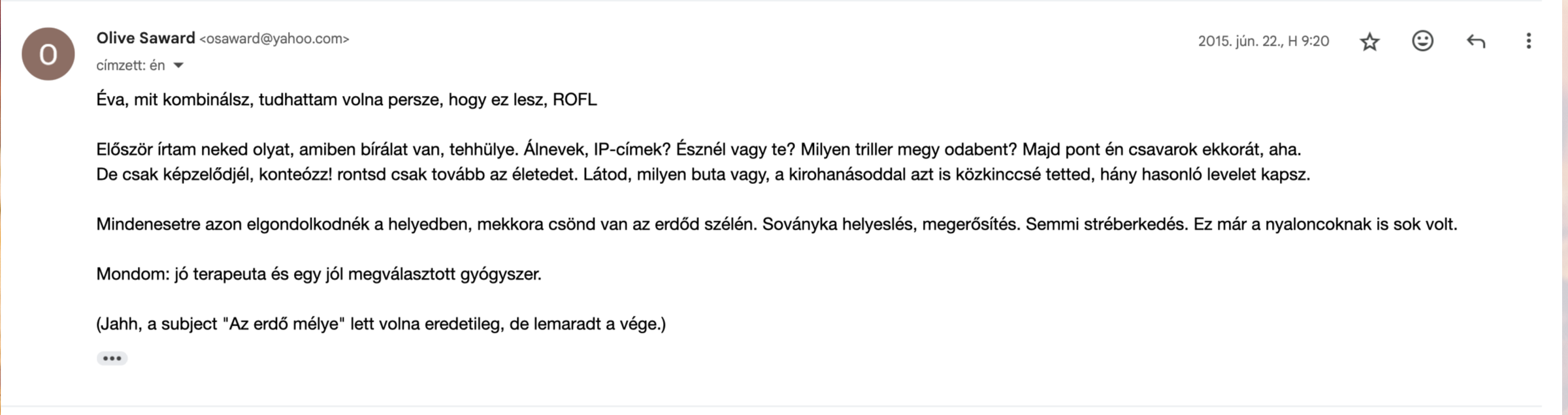 2015. június: megérkezik az első olyan gyalázkodó, trükköző levél, amelyet nem antifeminista lúzer, hanem a blogot és az életemet birtokolni vágyó nő, egykori rajongó. És aztán ilyenből több száz jön, förtelmes magabiztosság, rengeteg kioktató, manipulatív, cikornyás, jeremiási fordulat. Tesszerencsétlen, naná, kikönyököl a gonoszság, Éva, kitelt a becsület. Ő sajnál engem! Erre a posztra utal, dühítette, hogy magára ismert mint sittlerakóra, ezért szórja az átkokat.