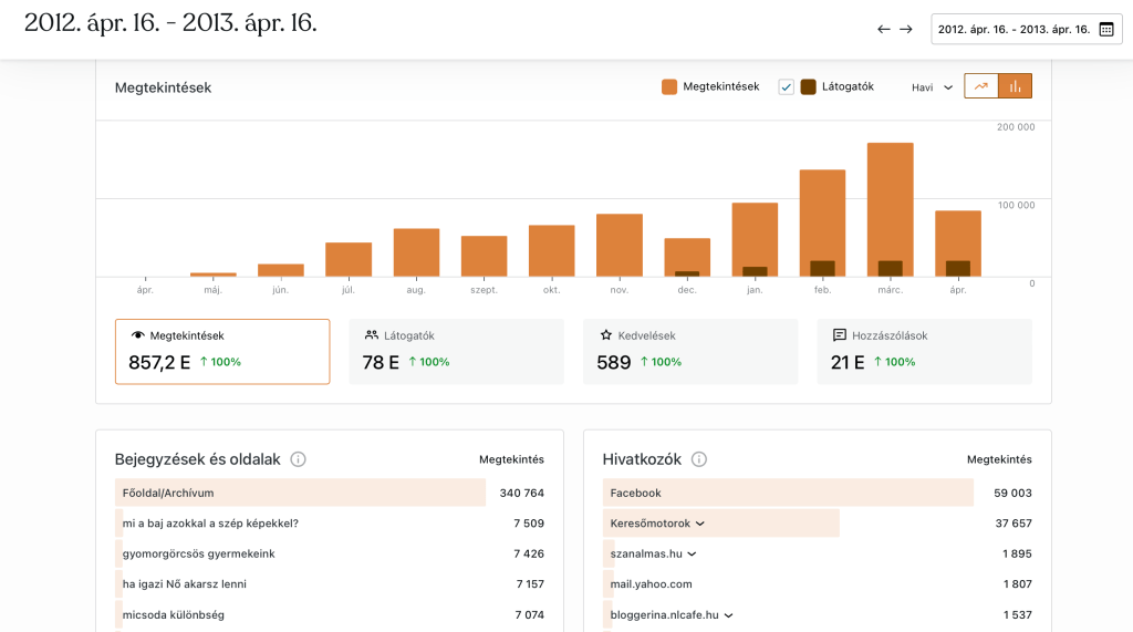 Az első év. Csak decembertől (sötét első rész az oszlopban)vezette be a wordpress, hogy számolja a kattintásokon kívül az egyedi felhasználókat (IP-címeket) is. A hivatkozók: szinte azonnal kiraktak a szánalmasra. Az esküvőm egy képét sikerült, amelyet 2013 januárjában, gyászban tettem ki. Gilicze Bálintnak hívják az illetőt. Onnan kattintott akkor ide 1895 fő. Nyilván mind magasan iskolázott, kökörcsineket fotózó, Kosztolányit és Wittgensteint sűrűn forgató ember volt.