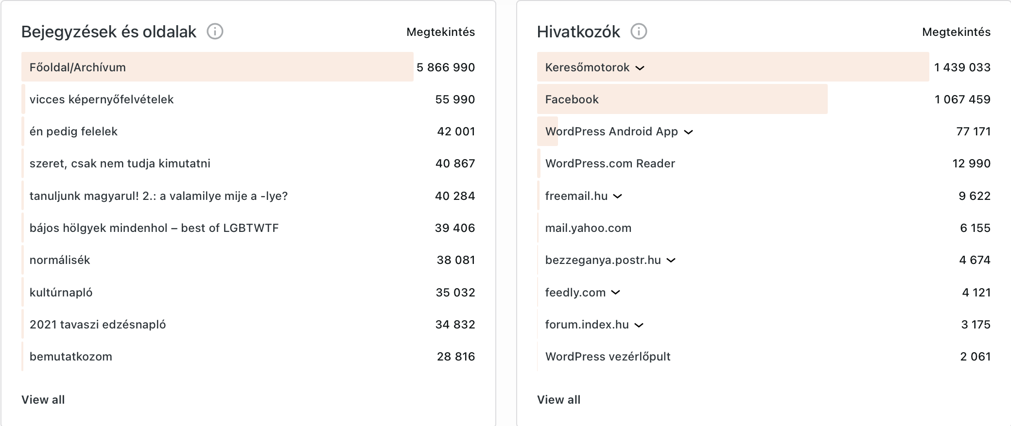 Ez pedig a legolvasottabb kilenc poszt/oldal evör, a mai napig, és azok a helyek (hivatkozók), ahonnan hozzám kattintottak. Igazából a posztokat kéne külön megnézni, mert az oldalak folyamatosan frissülnek, oda azért kattintanak (a sportnapló vagy a vicces képernyőfelvételek például ilyen oldal).