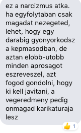 Ugye engem lelki szadisták a külsőmmel próbáltak megalázni, magam és a belső igazságom ellen fordítani, pedig 2015-re világos volt, hogy olyan attitűdre, értékrendre leltem, ami hosszú távon is öröm és működik. Nem akarok én másokra hasonlítani. Ez nagyon, nagyon dühítette őket. És ők nagyon küszködnek a testükkel. Voltam én minden, “egybederék, alkoholháj, széles, lapos tepsisegg, elefántiázis, cölöptérd, alig 168 centi, tömzsi x-láb, kihullott haj, felkopaszodás, ijesztő arc, bő hatvanas”. Szurkáltak, hogy mások bezzeg milyen szépek… Én nem akartam a hasonlítgatást, nem érdekelt, de akikre mondták, hogy szépek, azokat én csúfnak és antisportolónak látom.
