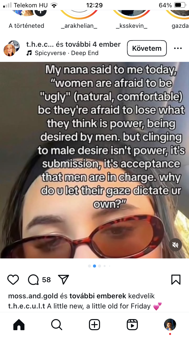 Vagy a nőiesség normái. Húúú. Csinos, ápolt, igényes. Micsoda szavak, ennyi erővel a homlokodra írhatnád: VIDÉKI VAGYOK, A TESTEM A VALUTÁM, TÖBBET TUDOK A GÉLLAKKRÓL, MINT ANTON PAVLOVICS CSEHOVRÓL. Annyira periferiális, hogy nem mernek natúrak lenni. És hajlandóak az egészséges testük miatt átszorongani az életüket.