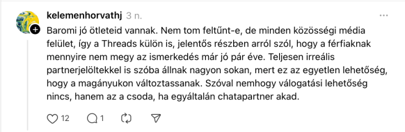 Ezért kell nagyon megbízni a másikban, ezért halott a tinder, illetve lehet ott bőkezű eltartót szerezni önmegtagadás árán, tehát prostituálódni. És ezerből ketten találnak ott klasszikus értelemben komoly kapcsolatot. Szóval hajrá. Egyébiránt jobb a határainkat, gátlásainkat és kamaszaink tiszta gyerekségét minél tovább megőrizni. Az én gyerekeim nem durvultak el, és ezért válnak sorozatosan áldozattá – de sokkal jobb így, mint (mert tönkretették a ballagást is) nemecseken taposni, tizenöt évesen gyógyszereken élni és szégyengyerekké válni.