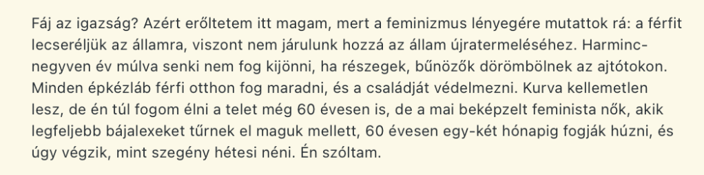 Ezügyben én is szkeptikus vagyok. Az efféle posztolgatást, lásd Hegedűs “NEManya” Bettina, mulatságos, más teljesítmény híján való fitogtatásnak gondolom. Sőt, hazugságnak, mert az öntelten posztolgató nőre rákövül a szerep, és neki soha nem lesz, nem lehet rémes sztorija. Vagy igen, mert az áldozatiság is hálás kontent, de ő nem bán meg semmit, nem az ő hibája, hiszen nem sérülhet a koncepció: poliamória, gyakran változó partnerek, buli, kísérletező kedv; biztonságos, traumát, terhességet és nemi betegséget soha nem okozó kalandsorozat, és persze mindenki tisztel mindenkit. Degradálóan ezzel az istennővel úgy szabad beszélni, hogy arra direkt megkérte előzetesen a fickót, és két tanúval aláíratta. Ő aztán kontrollban van. Ő jól csinálja, bezzeg mi! Aki pedig ezt az egészet bírálja, az savanyú/nőellenes/prűd/fideszes.