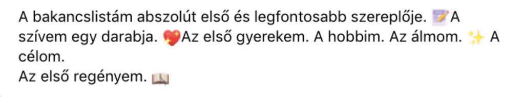 Hohó, de te nem csak magadat akartad megvalósítani, hanem automatikus validációt is, közönséget, lelkesedést – erre kellett a trükk, hogy én ne ítélkezzek, amikor mondtam, hogy a tetkód sittes, trippered lesz és nyaki sérved, a könyved pedig gyenge.