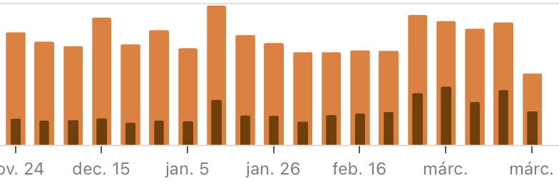 Sokan lettünk, megugrott a látogatószám, olyan IP-k járnak itt, és sokkal többen (de nem gyanús országokból), akik nem szoktak. A barna oszlop az egyedilátogató-szám a narancssárga kattintásokon belül: