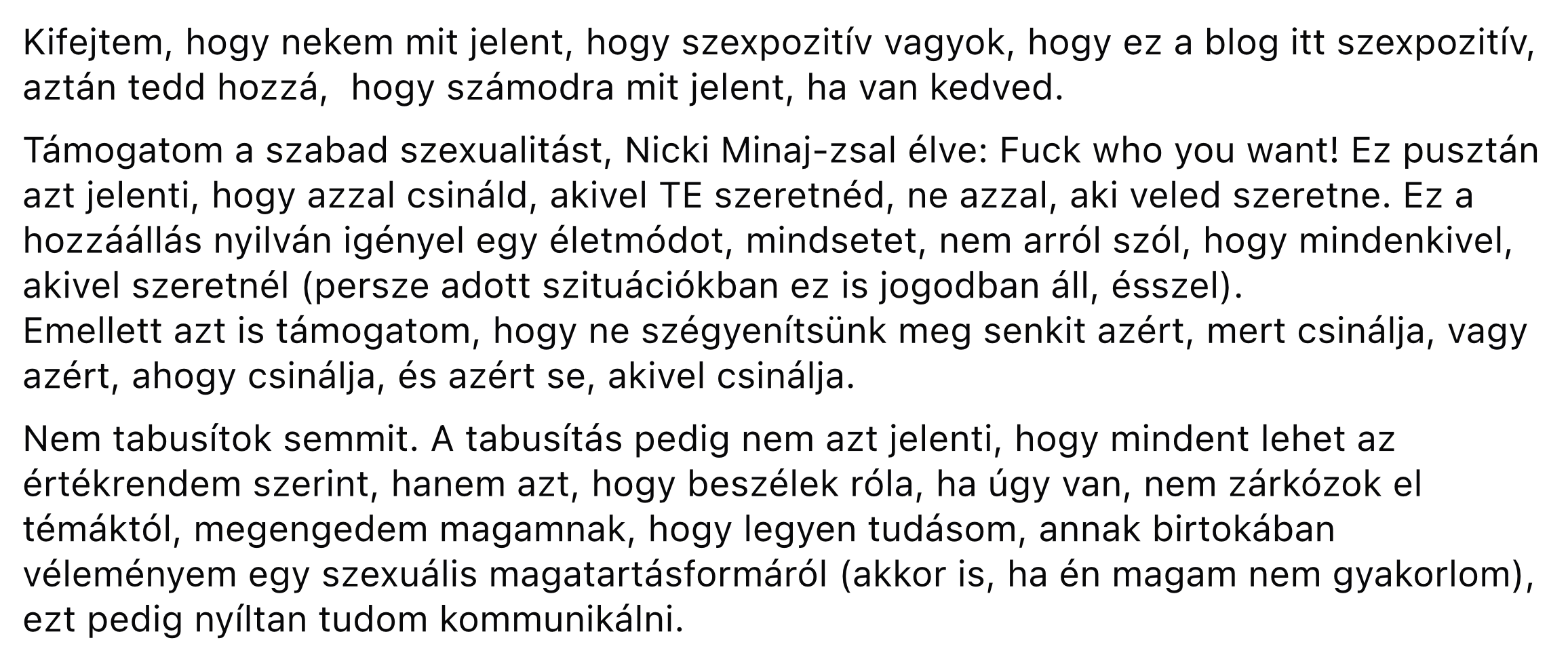 Én azt mondom, és hát honnan mondom, ötven évesen, több szép szerelemmel, kapcsolatban élve, mindig is életigenlő, szexuálisan aktív attitűddel, háromgyerekes anyaként, és nekem a nemiség egésze szép, minden testrész, szag, nedv, a szülés, a méhlepény látványa. Én azt mondom: a szexualitásban rút, aljas és átkot hoz minden, aminek nincs köze az emberi szeretethez, kommunikációhoz, játékhoz, és a potenciálisan életet teremtő transzcendenciához. És aki ezt nem érti, és aki a rútságot nem akarja kikerülni, annak keserves lesz az élete. a kölcsönös, emberi egyezésen alapuló szeretettel kommunikációs az mind olyan, mint valami nagyon torz, jellemet tönkretevő függés, lelki betegség, és ezer jele van annak, hogy ezt nem kéne.