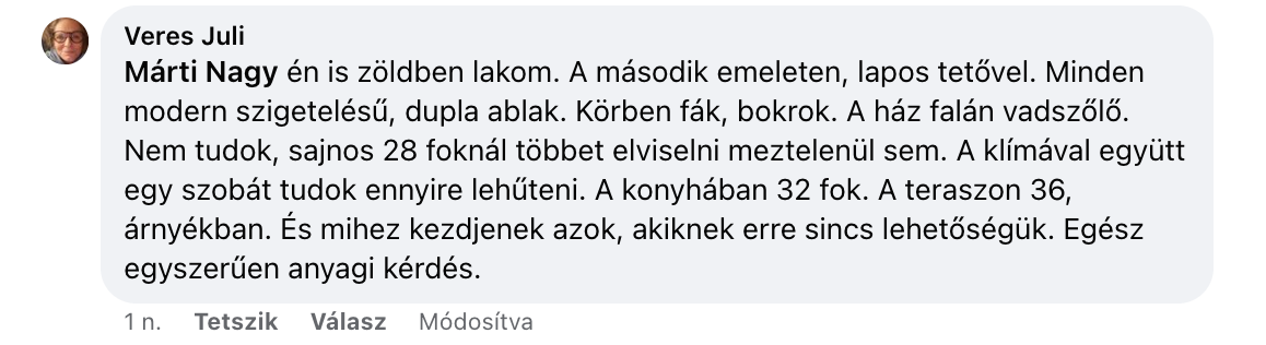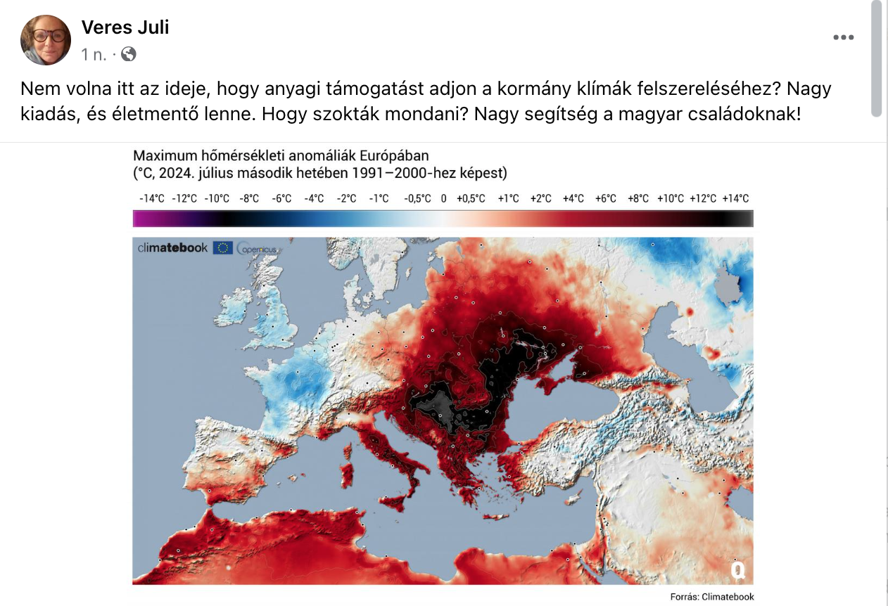 Nem érzem extrémnek, volt már ilyen régebben érzetem szerint. Nagyon verik a kolompot, de ez főleg médiajelenség, tudni kell a helyen kezelni. Lehet, hogy alacsonyabb hőfok volt, de vagy az életmód (rohangálás, nap, máshol laktunk, vékonyabb falak), vagy a fittség hiánya miatt nehezebben bírtam. Dagadt régen a bokám, most szép, víztelen, erek vannak rajta. Nem gáz, zuhanyzok, napozni is szoktam, és kint alszom a teraszon. Viszont ahogy ezek pattognak, “oldja meg a kormány!”, azt vigyorogva figyelem. Mert ők egészségroncsolók. Ez a nő Hollandiából lármázik (lásd az enyhe kéket). Klímaválság, klímakövetelés, kilövő energiaárak: