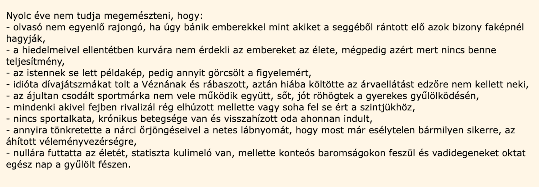 Főleg utólag, rólam írták, hogy csalódtak, konkrét ok nélkül, de úgy, hogy láthassam, nyilvánosan. És szaglásztak utánam, taglaltak, ki hol látott, beszélt egy ismerősömmel, a primitív műanyaganyukával és ír alkesszal is azonnal összeálltak. Közben egymást ők leszarják, engem gyűlölnek, ez a hobbijuk.