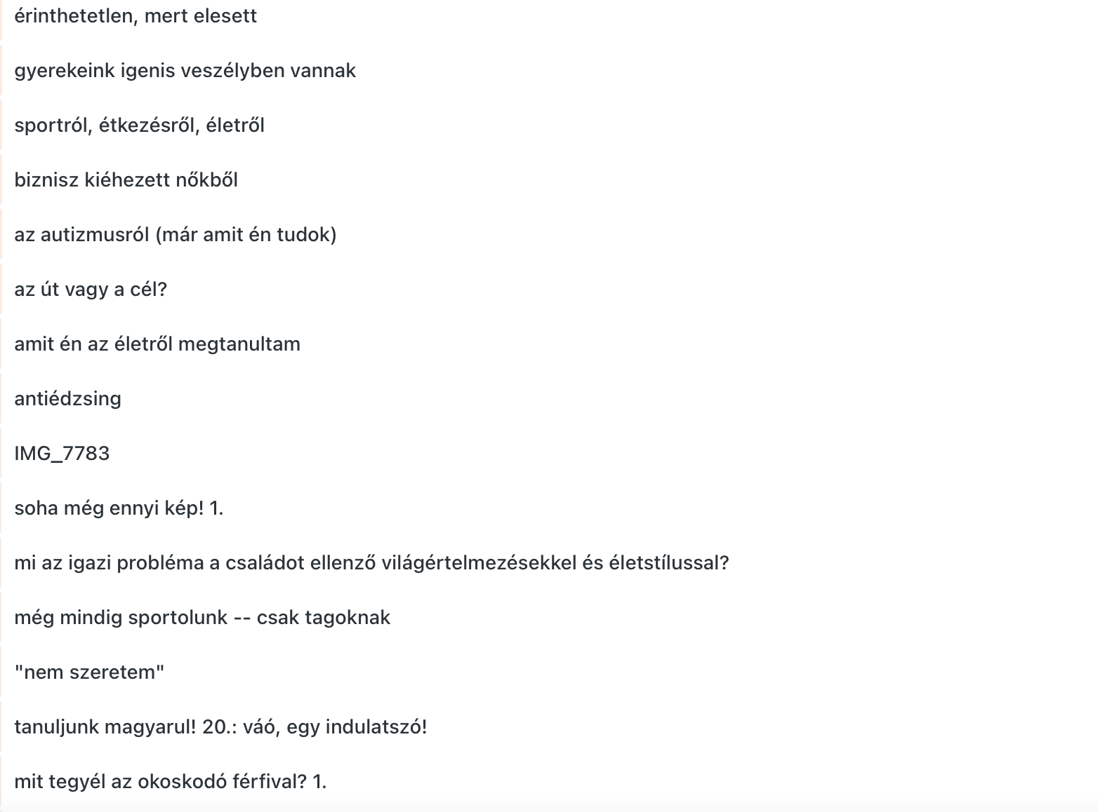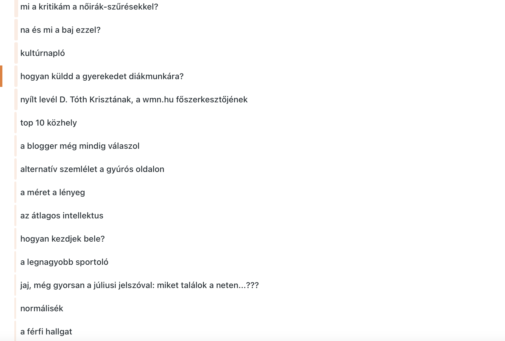 Vissza-visszatérő magyarázat a fröcsögés közben, hogy eleinte jó volt a blog, de aztán elromlott. A témák nem érdekelték őket, ezek a 2013-14-es legaktívabb, leghangosabb kommentelők később felpörögve, függőként akartak kizárólag fecsegni. Sértőnek találták, hogy nekem nem oké, ha valaki liba, társkeresőzik, kettős viselkedést folytat a férjével (én nem ismertem az ő életüket). Addigra elteltek a lakossági feminizmus szintjén a női, anyás posztokkal, és nem tudtak a kultúrához, edzéshez kapcsolódni, mert nem olvasnak, nem néznek szerzői filmeket, nem fizetnek színházjegyért, nem edzenek – frusztráció. Egyikük a jelenlétemben akarta felszedni egy randira bepofátlankodva a szerelmemet, úgy, hogy nagyon kértem, ne jöjjön, de mások is, később is rámozdultak a szerelmeimre. Ürügy voltam a kisgömböcöknek.