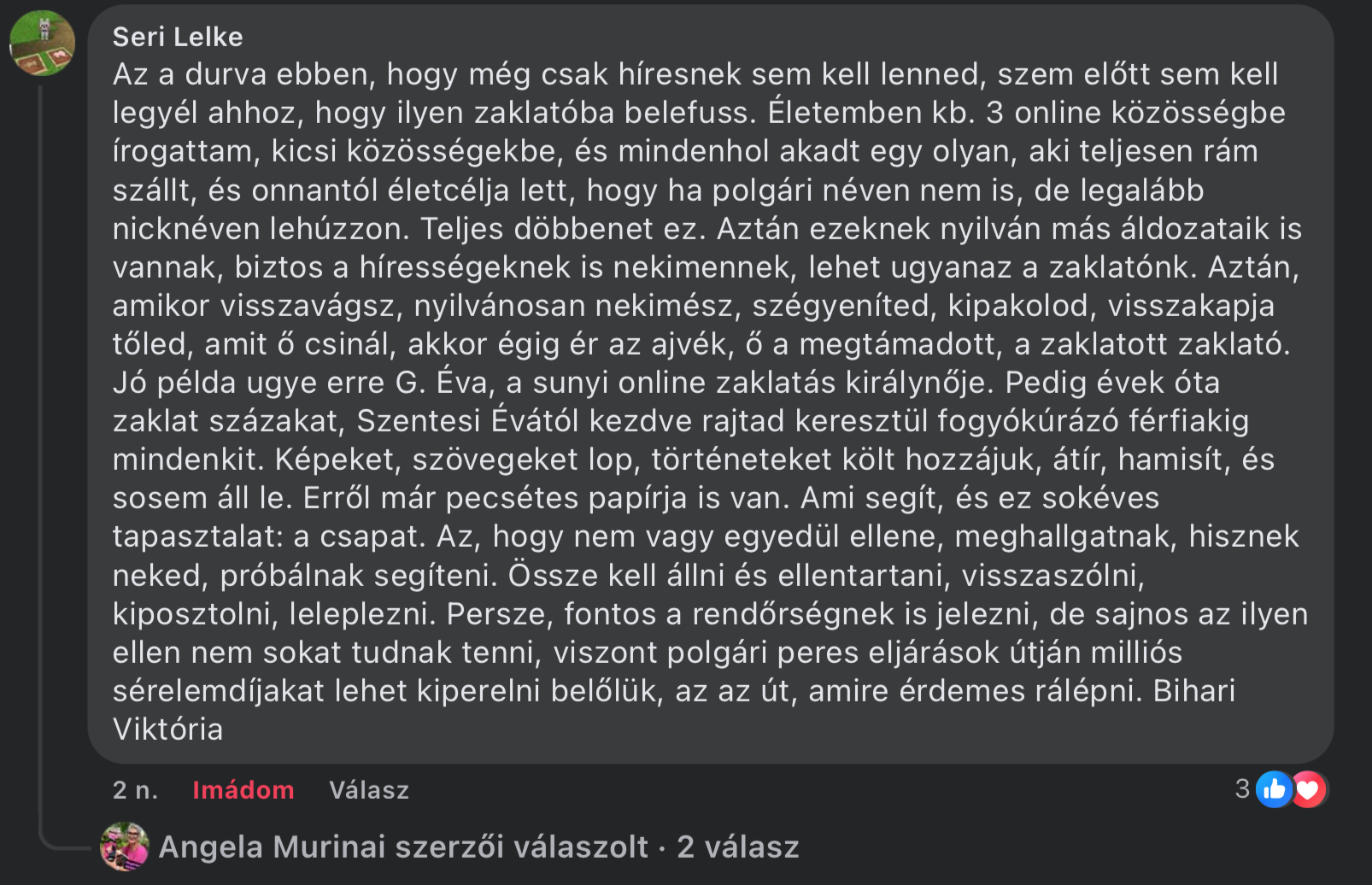 A túlzó rajongás visszaüt, érzelmi éretlenség jele. De nem lenne ez az egész ennyire durva és pervazív, vagyis már elült volna, ha nem fajul el a rászállásban egy tőlem független netes csoport, a legalja, akivel ügyvédúr, Angéla és Villő összebratyiztak, oda járnak lelki erősítésért, ot akarnak népszerűek lenni (ezek nettó bűnözők, van, aki emiatt elmenekült az országból, van súlyos testi sértésért lesittelt arc, aki már a halálomról is értekezett, és extrém prostituált is). Más lenne a sztori, ha nem leszek én a célpontjuk ezeknek az idegeneknek, mert unatkoztak, rákaptak, hogy bármit megtehetnek álnéven, és élvezik.