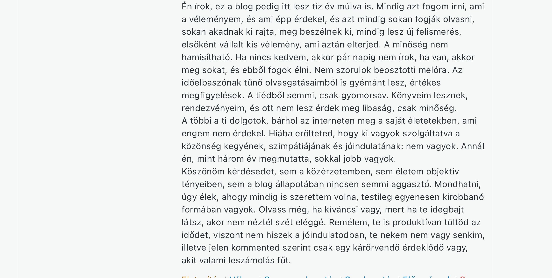 Van elképzelésed arról, miért utáltak meg téged pont a legaktívabb olvasók? Érdekelte ezeket valaha, ami olyan érdekes itt: könyvek, élmények, a nyelvi fordulatok? Mi ez a pokoli düh, vádak, röhögő pletyka, miért hittek idegeneknek, mi bajuk volt veled? Mert szerintem… (és leírja, sok magánjellegű részlettel. Én még a kérdésnél megálltam, és az ő magyarázatát csak utána olvastam el – a kezdetektől és szinte naponta olvas)