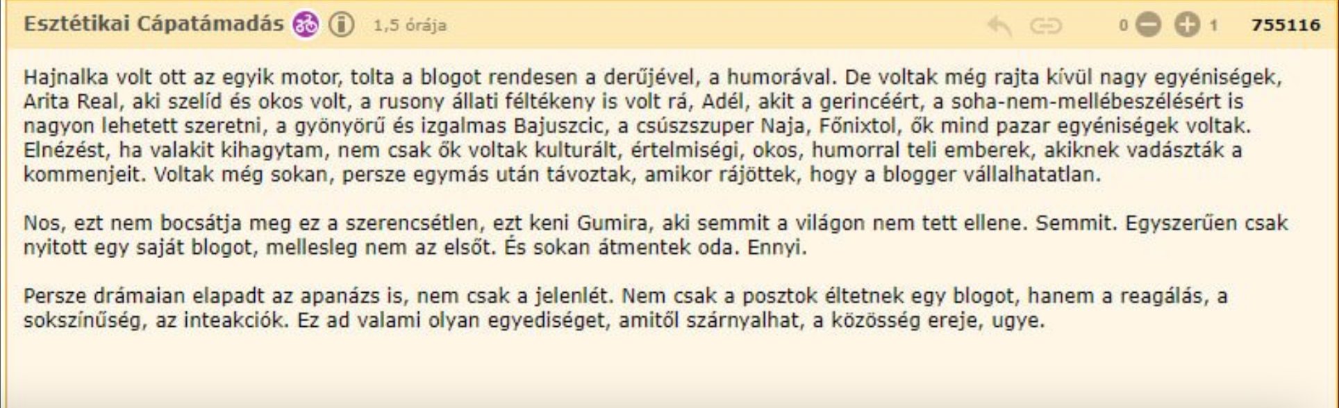 Hozzáteszem: bárkinek joga van így írni. Csak ti mégsem írtok, ki olvasná? Viszont az én szövegeim miatt hápogtok. Hajrá, építs fel olvasóközönséget! És persze vállald a következményeket. Én vállaltam. És ez a blog még mindig pörög.