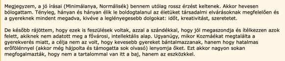 De a másik “gonoszságom”, és most erről írok, hiszen tizenegy éve kezdődött a mocskolódás: az a bűnöm állítólag, hogy nem sajnáltam Kozmát, nem neveltem meg (“edukáció”), nem segítettem rajta, hogy ne legyen gyerekbántalmazó és ne nyomorogjanak. Gyerekrevolver.